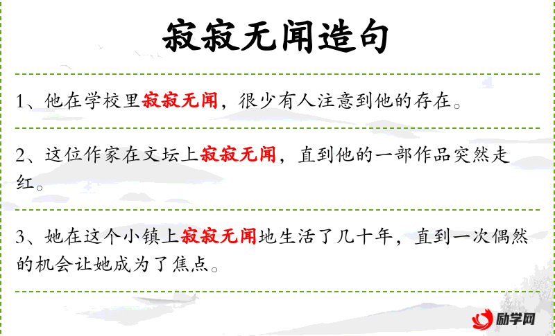 - 寂寂无闻:形容词短语,意为不为人所知,默默无闻