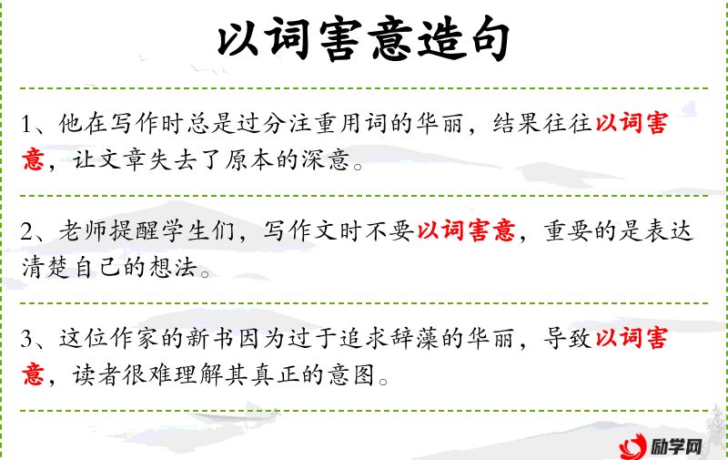 - 以词害意:指过分追求词汇的华丽而损害了文章的本意。
