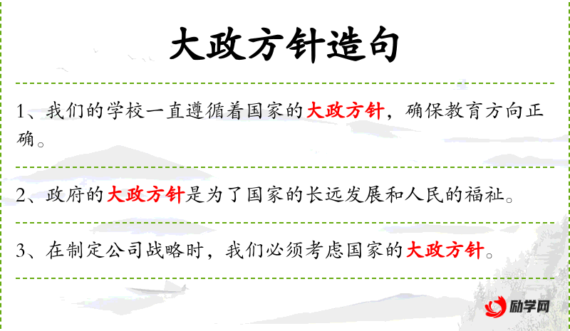 - 大政方针:指国家或政党制定的重大政策和指导原则。
