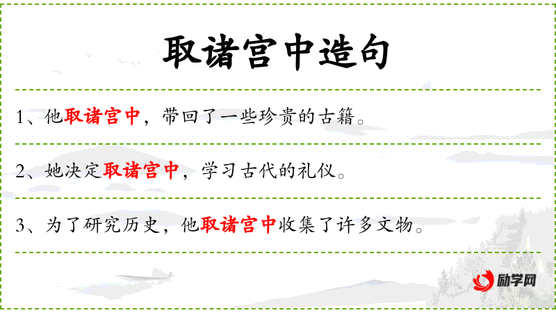 句子:“为了研究历史,他取诸宫中收集了许多文物。”