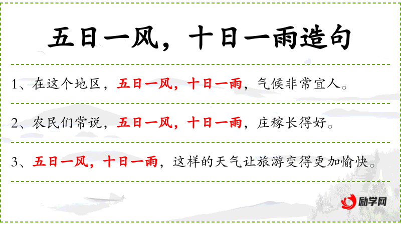 - 五日一风,十日一雨:成语,形容天气稳定,风调雨顺,比喻生活安定,环境良好。