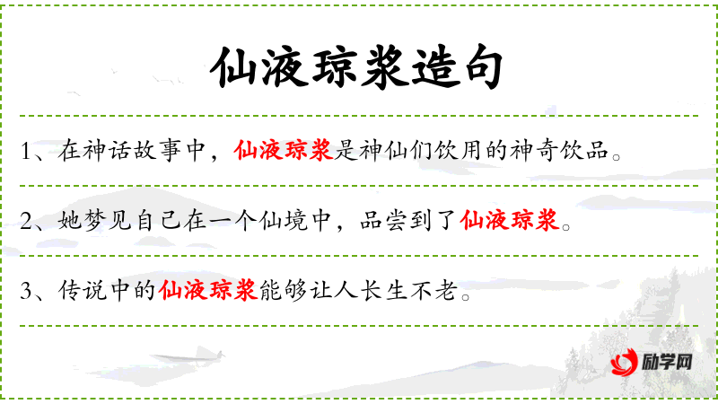 - 宾语:自己能够找到一瓶真正的仙液琼浆