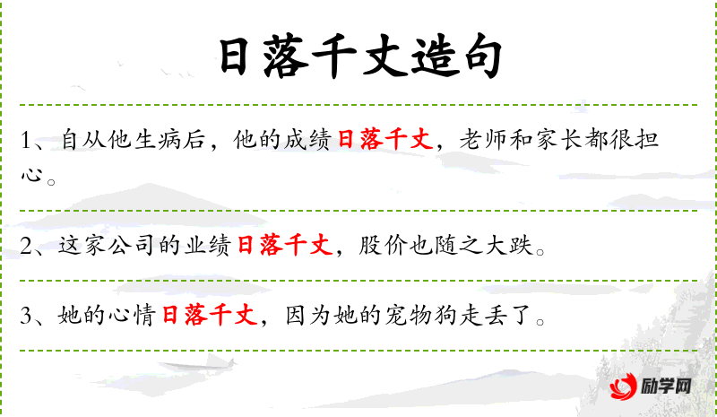 - 日落千丈:比喻事物迅速下降或恶化,源自成语“日落千丈”。