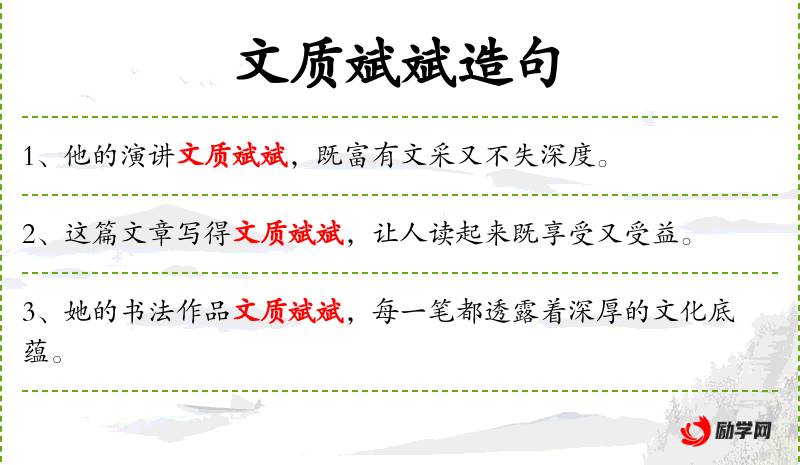 - 文质斌斌:形容文雅而有内涵,文质兼备。