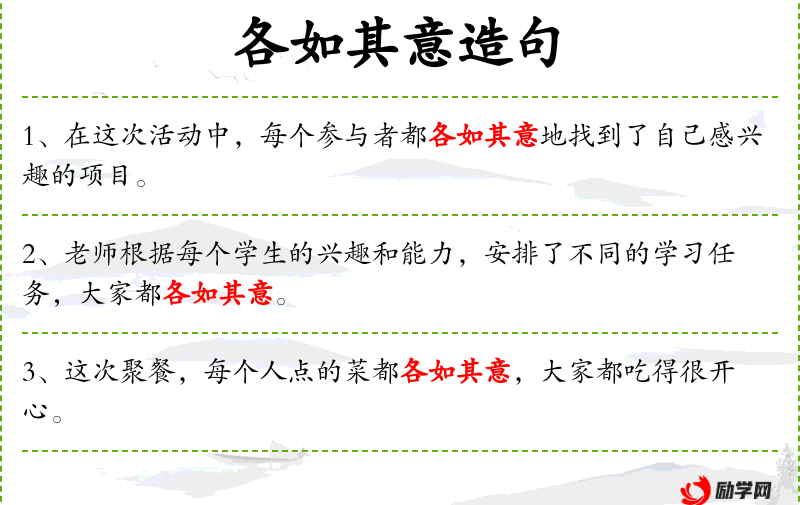 3. 【各如其意】 如:达到;愿:意愿。每个人都能达到或实现自己的愿望。