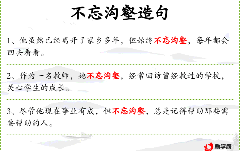 句子:“他虽然已经离开了家乡多年,但始终不忘沟壑,每年都会回去看看。”