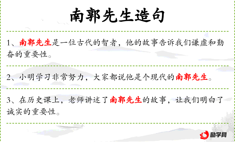 句子:“南郭先生是一位古代的智者,他的故事告诉我们谦虚和勤奋的重要性。”