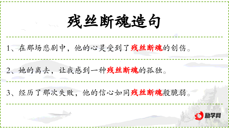 3. 【残丝断魂】 - 残:剩余的;丝:蚕和其它昆虫吐的丝;断:断绝;魂:魂魄。比喻即将死亡的生命。