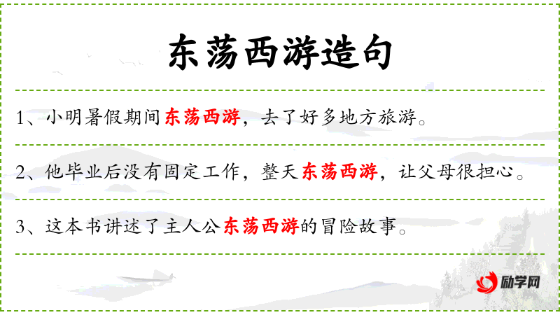 - 东荡西游:成语,形容四处游历,自由自在。