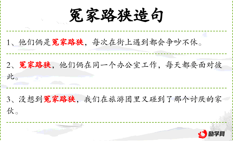 - 冤家路狭:成语,意思是两个有矛盾的人总是不期而遇。