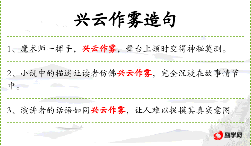- 兴云作雾:形容云雾缭绕,景象壮观。
