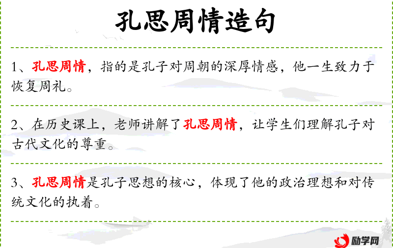 句子:“孔思周情,指的是孔子对周朝的深厚情感,他一生致力于恢复周礼。”