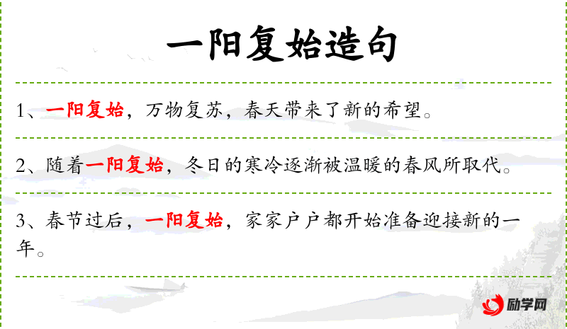1. 【一阳复始】 - 古人认为天地之间有阴阳二气,每年到冬至日,阴气尽,阳气又开始发生。指春天又到来了。