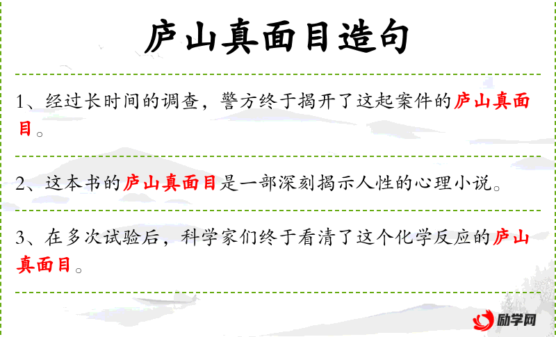 句子:“经过深入研究,历史学家揭示了这段历史的庐山真面目。”