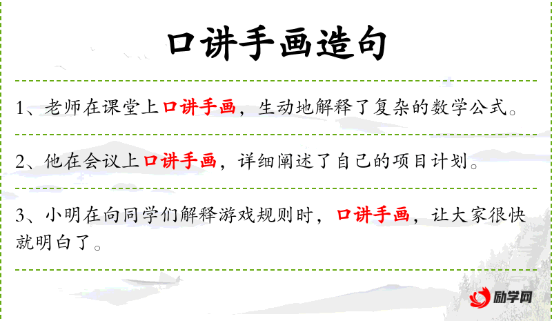 - 口讲手画:指边说话边用手势或图画辅助说明,增强表达效果。