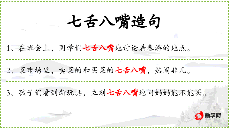 1. 【七舌八嘴】 - 形容人多口杂。同“七嘴八舌”。