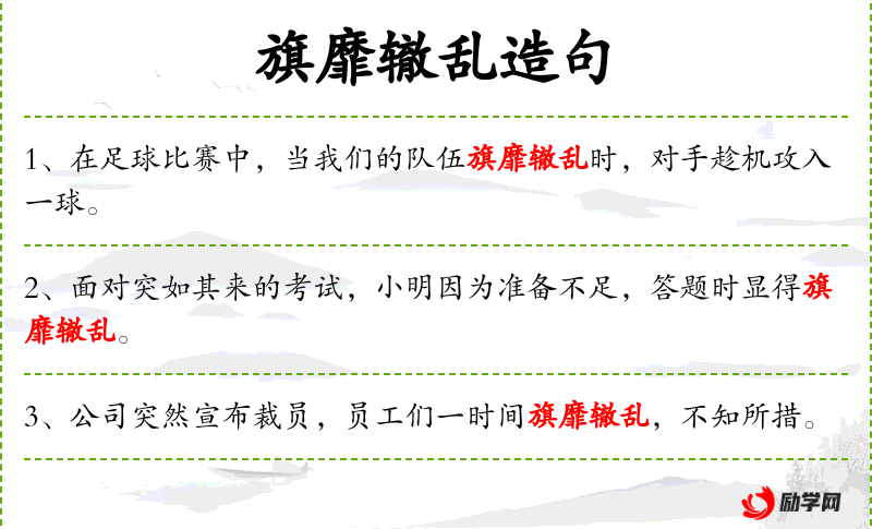成语“旗靡辙乱”:源自古代战争,形容军队溃败,场面混乱。在这里比喻小华的表现失控。