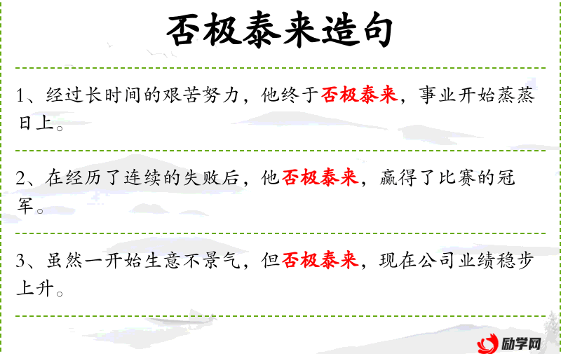 - “否极泰来”是文化中的一个重要成语,反映了人对事物发展规律的理解,即事物发展到极点后会向相反方向转化。