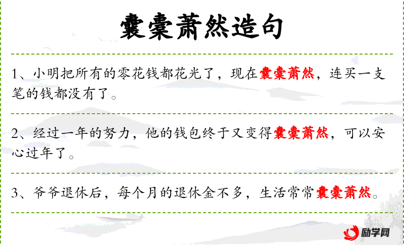 - 囊橐萧然:形容钱包空空如也,没有钱。