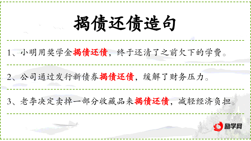 1. 【揭债还债】 揭债:借债。用借债的办法还债,亏空始终存在。