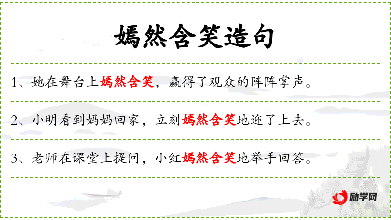 - 嫣然含笑:成语,形容女子笑容美丽动人。