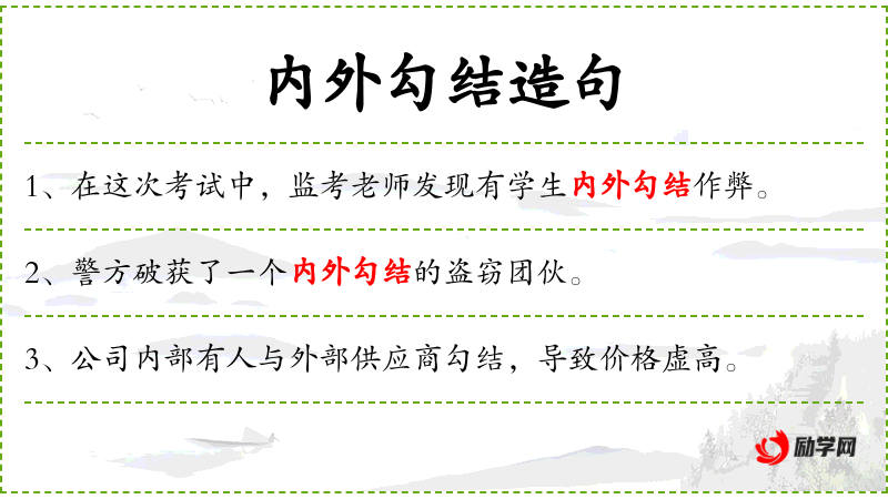 - 内外勾结:指内部人员与外部人员相互勾结,共同进行不法活动。