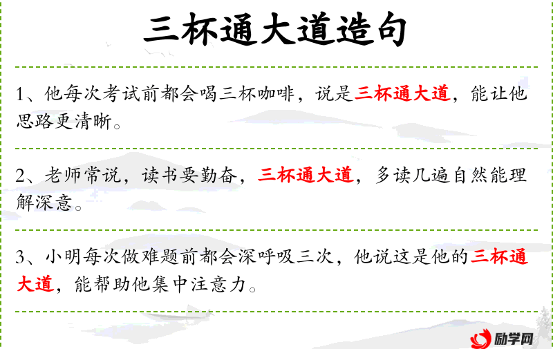 1. 【三杯通大道】 三杯:指饮了三杯酒;大道:宽广的道路。三杯酒下肚,可达理想境界。形容旧时文人因政治上不得意,靠饮酒来安慰自己,自我陶醉。