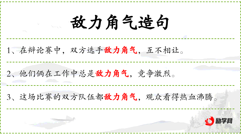 - 敌力角气:可能是误用的成语,正确的成语应该是“斗志昂扬”或“争强好胜”。