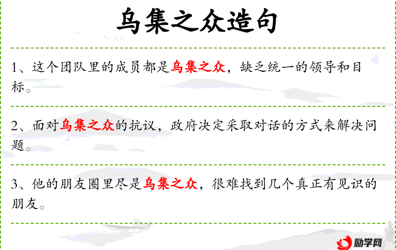 - 乌集之众:形容词短语,指人群聚集在一起,通常带有贬义,暗示人群的无组织或混乱。