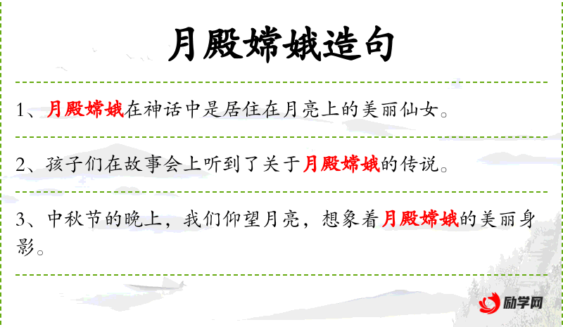 3. 【月殿嫦娥】 嫦娥:神话中月宫里的仙女,相传她是后羿的妻子,因偷吃不死之药而上了月宫。月中仙子。比喻风姿绰约的美丽女子。