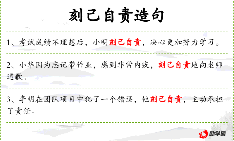 - 刻己自责:动词短语,表示严厉地责备自己。