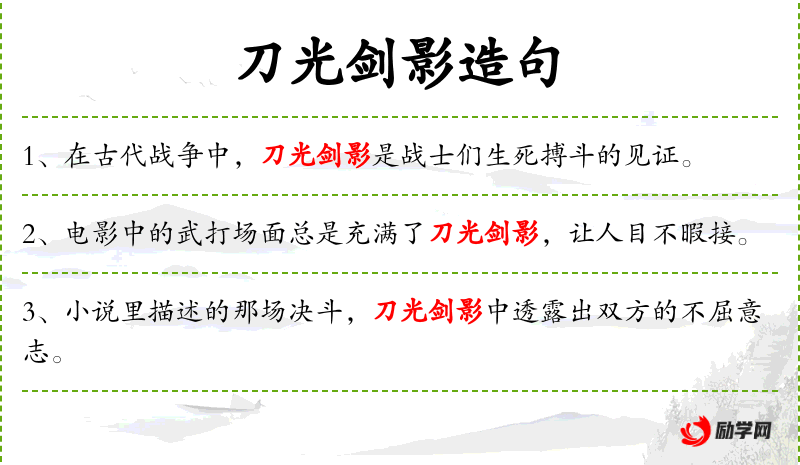 - 成语:“刀光剑影”是一个成语,用来形容战斗的激烈。