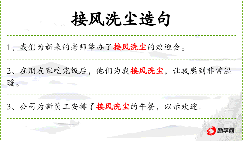 - 接风洗尘:一种欢迎远道而来的客人的传统*俗,表示欢迎和尊敬。