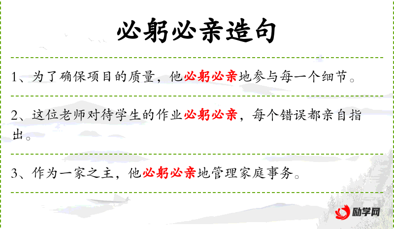 - 必躬必亲:表示亲自去做,不假手他人。