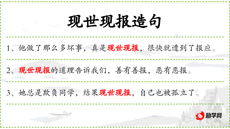 3. 【现世现报】 - 报:报应。原为佛家语。后指人做了恶事,今生就会得到报应。意指报应很快。