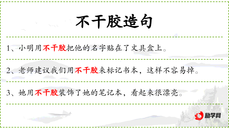 1. 【不干胶】 - 一种复合材料,在纸张、薄膜等的背面涂上胶,再附上保护纸,使能长久保持黏性。用时揭去保护纸即可粘贴,多用于制标签。