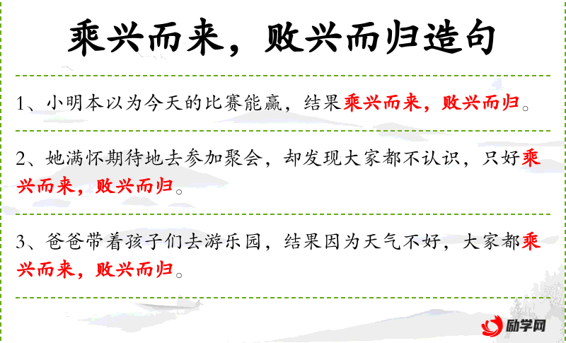 - 状语:“因为下雨”、“都”、“乘兴而来,败兴而归”
