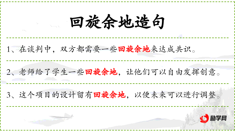 - 回旋余地:指在处理问题或关系时有灵活调整的空间。