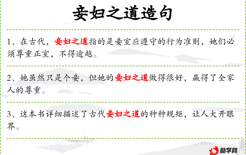 句子涉及到的“妾妇之道”可能与古代*的家庭结构和文化俗有关。在古代**,妾室在家庭中的地位通常较低,但通过特定的行为准则或策略,她们有时能够获得一定的影响力。