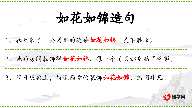 “如花如锦”这个成语源自**传统文化,用来形容事物非常美丽和华丽。在现代社会,这样的表达常用于形容女性的服装或装饰品。