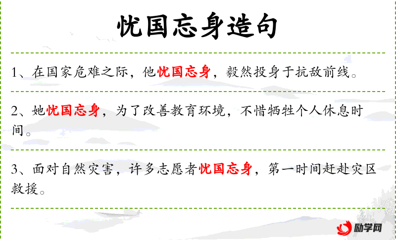 - 忧国忘身:成语,意思是忧虑国家大事而忘记个人的安危。