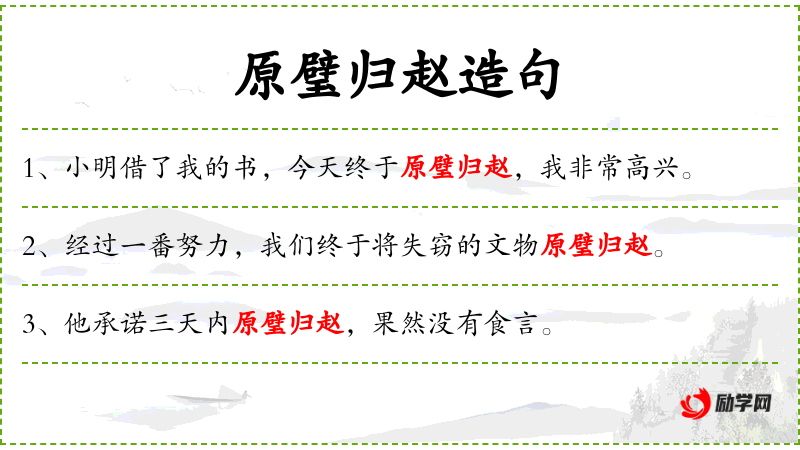 - 文化背景:“原璧归赵”是一个**成语,源自历史故事,强调归还失物的重要性。
