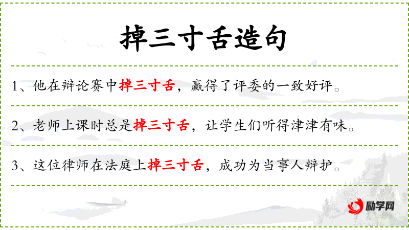 “掉三寸舌”是一个成语,源自《史记·平原君虞卿列传》,比喻口才极佳。这个成语体现了文化中对能言善辩者的赞赏。