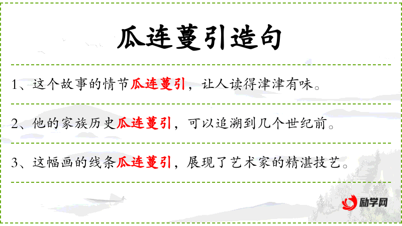 1. 【瓜连蔓引】 - 比喻人事上辗转牵连。