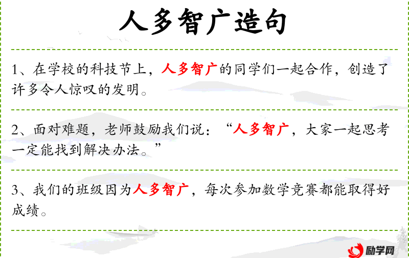 句子中“人多智广”是一个成语,反映了**文化中对团队合作和集体智慧的重视。