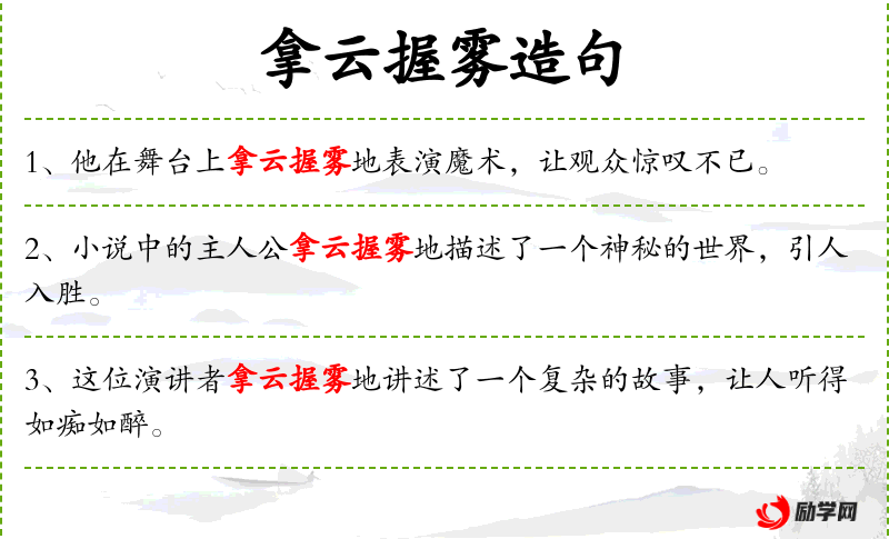 “拿云握雾”是一个成语,源自**古代文学,形容人的手法高明,难以捉摸。这个成语的使用体现了中文表达的丰富性和形象性。