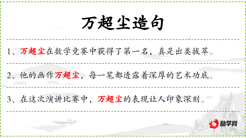 3. 【苍劲】 - (树木)苍老挺拔:~的古松;(书法、绘画)老练而雄健有力:他的字写得~有力。