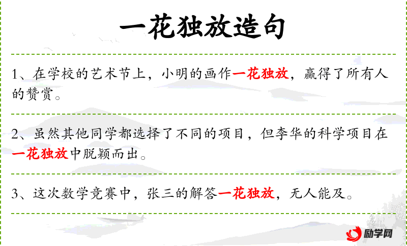 1. 【一花独放】 - 一种花独自开放。与“百花齐放”相对,常比喻缺少各种不同形式、风格的艺术作品。