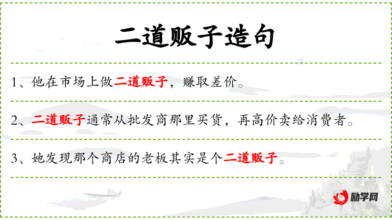 - 二道贩子:指中间商,从批发商那里购买商品后再转卖给消费者。
