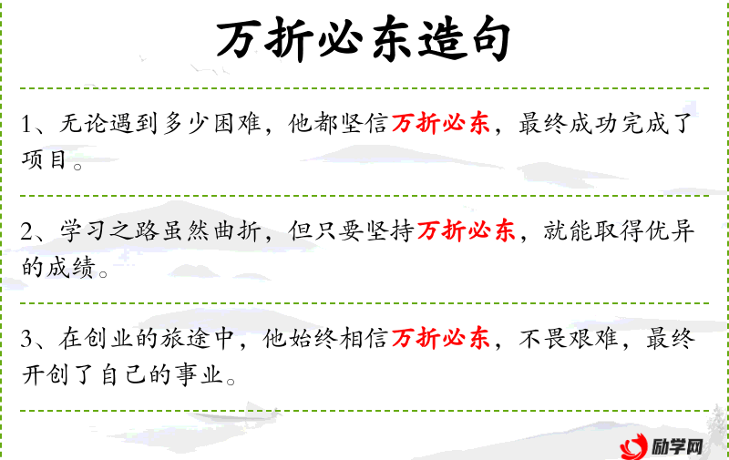 1. 【万折必东】 - 河流不论有多少曲折,最后都东流入海。比喻事物不管有什么曲折,总要按着应有的规律发展。